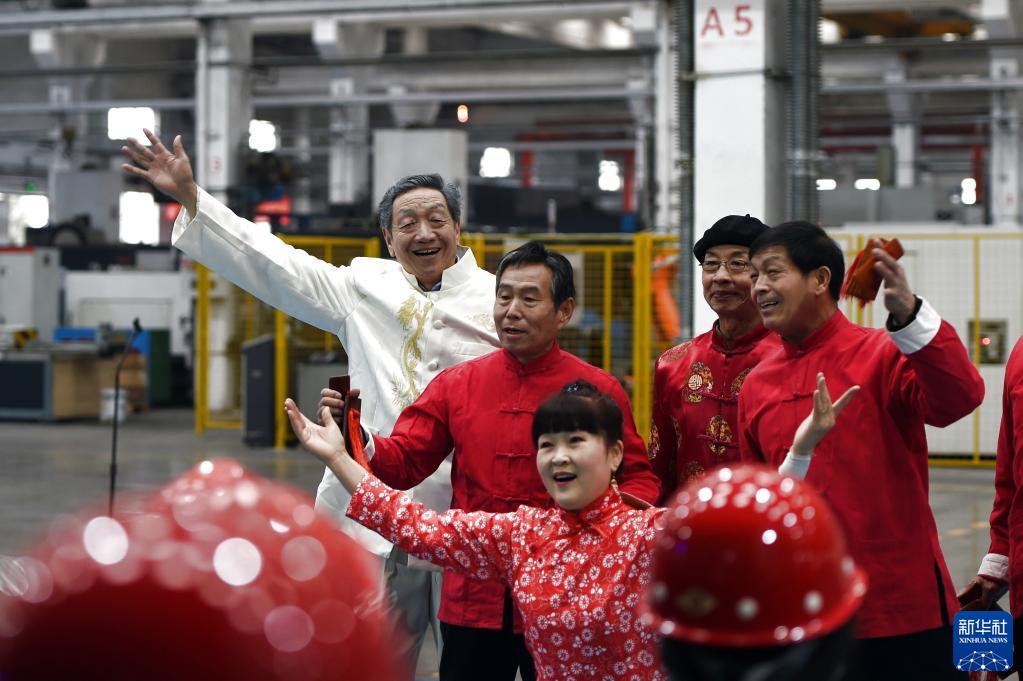 2月13日,在河北電機股份有限公司生產(chǎn)車間,李俊岐(左一)與石家莊市欒城區(qū)樓底農(nóng)民工俱樂部成員在現(xiàn)場演出節(jié)目。