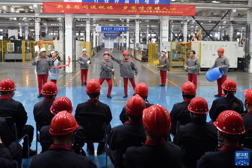2月13日,在河北電機股份有限公司生產車間,石家莊市欒城區樓底農民工俱樂部成員在現場演出節目。
