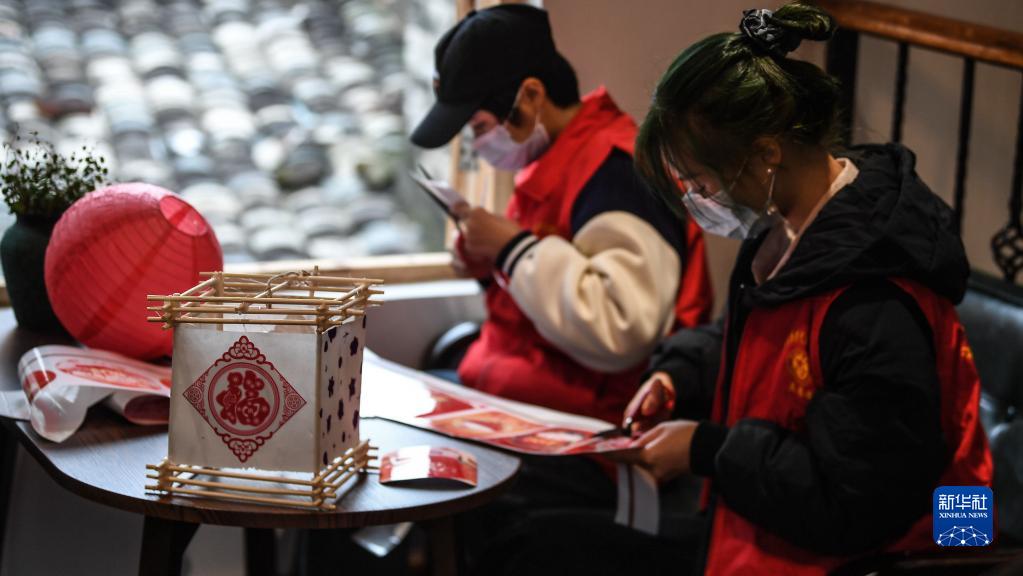 2月15日,在廣西欽州市百年老街,兩名女士在剪紙扎燈籠。