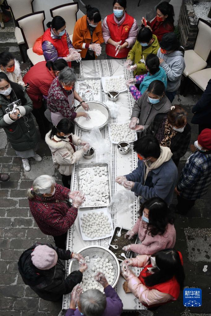 2月15日,在廣西欽州市百年老街,市民們搓湯圓、包餃子慶祝元宵佳節。