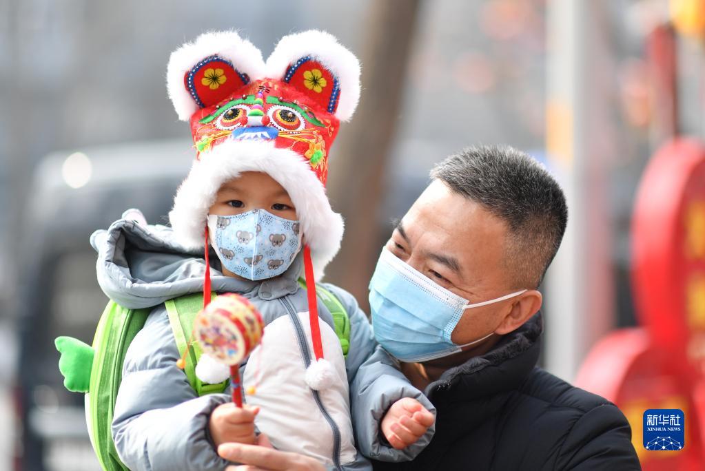 2月15日,戴著虎頭帽的小朋友和家人在西安永興坊游覽。
