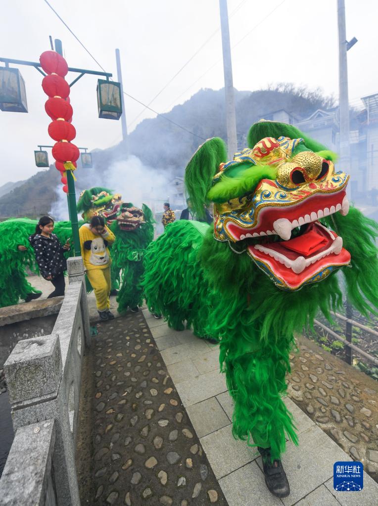 2月15日,綠獅花燈隊在浙江省杭州市淳安縣屏門鄉齊坑村表演。在齊坑村舉行的鬧元宵活動上,杭州市級非遺項目“齊坑綠獅”和花燈環游等表演讓游客和村民感受傳統文化的魅力。