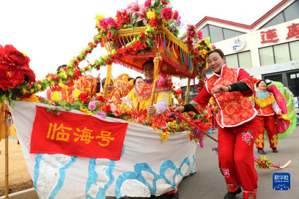 2月15日,民間藝人在江蘇省連云港市連云區(qū)連島漁村表演“劃旱船”。