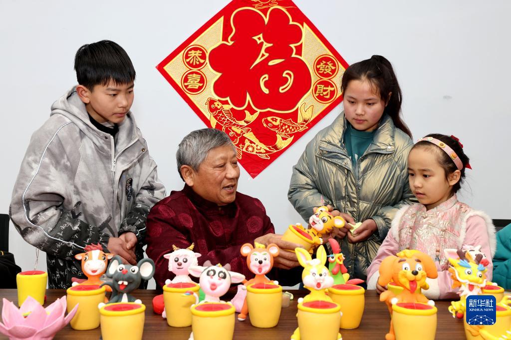 2月15日,在山東省棗莊市孟莊鎮大郭莊村,民間藝人闞宗勤(左二)向孩子們傳授“十二生肖面燈”的制作技藝,讓孩子們感受傳統文化的魅力。