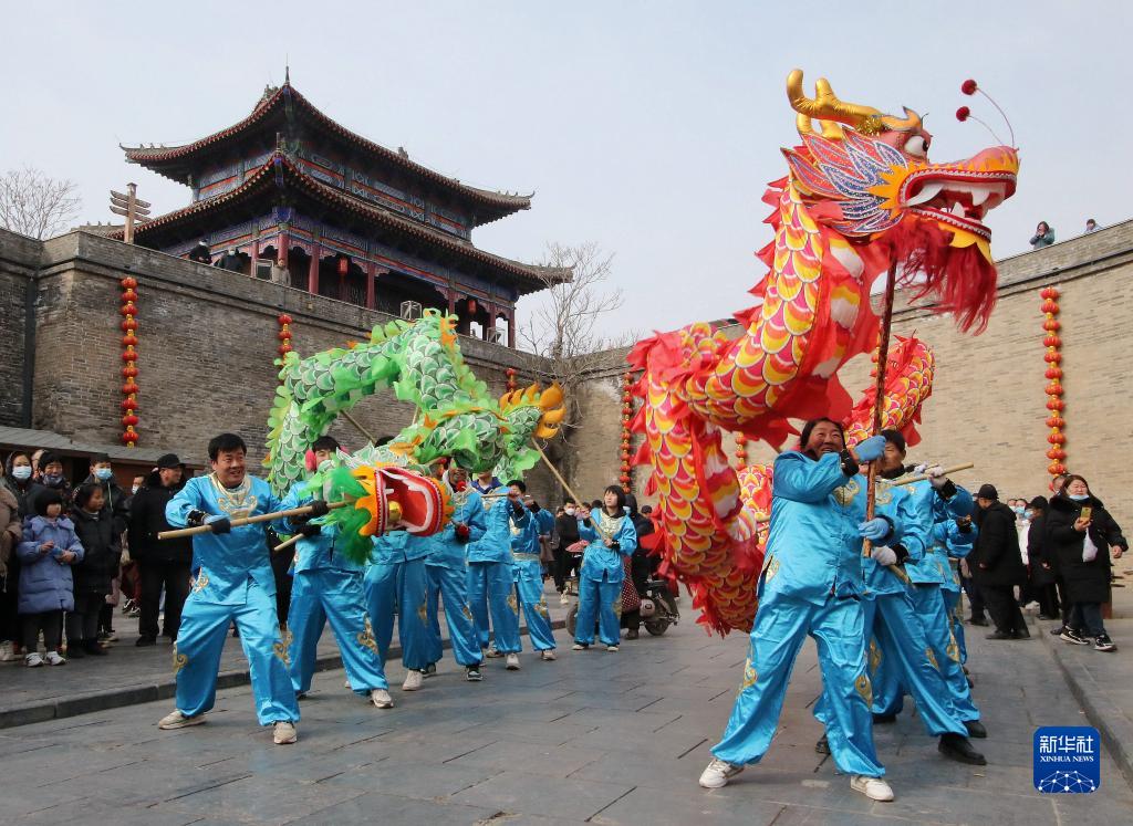 2月15日,民間藝人在河北省邯鄲市永年區廣府古城表演舞龍。
