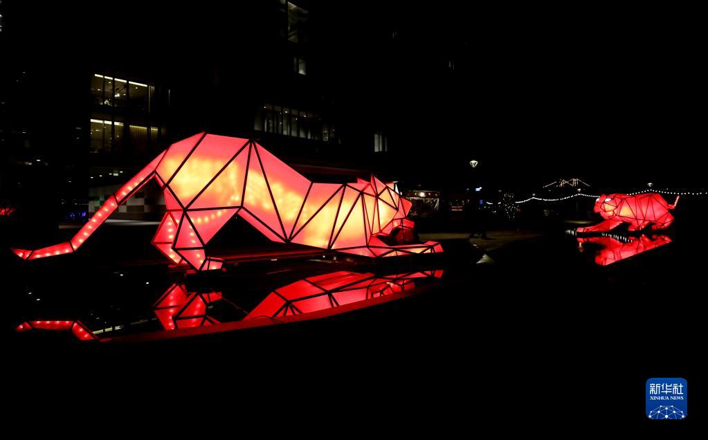 2月17日,在英國倫敦,慶祝中國虎年的燈光藝術(shù)裝置在巴特西發(fā)電站燈光節(jié)上展出。