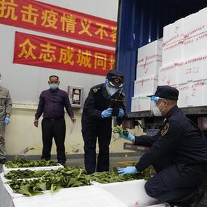 2月18日,工人把供港蔬菜的貨箱裝載到輪船上。新華社發