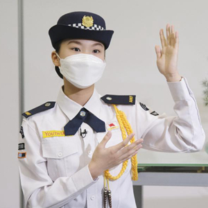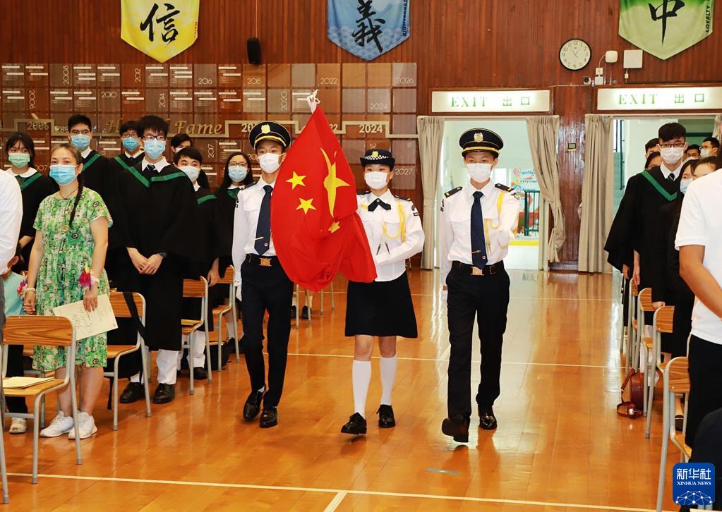 在基督教香港信義會元朗信義中學,辜廷恩(中)手擎著五星紅旗走進禮堂(2021年5月26日攝)。