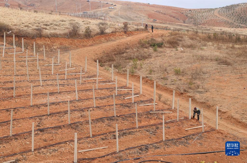 2月21日,在云南省賓川縣雞足山鎮,村民在裝有節水灌溉設施的水果種植基地里勞作。