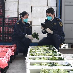 2月21日,在深圳大鏟灣碼頭,滿載供港蔬菜、水果、雞蛋的集裝箱吊裝上船。