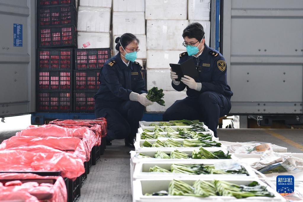 2月21日,在深圳大鏟灣碼頭,深圳海關(guān)工作人員查驗(yàn)供港蔬菜。