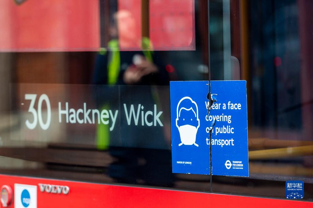 這是2月21日在英國倫敦拍攝的一輛公共汽車上破裂的佩戴口罩告示。