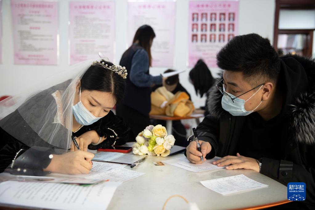 2月22日,在哈爾濱市道里區(qū)民政局婚姻登記處,新人在登記結(jié)婚。