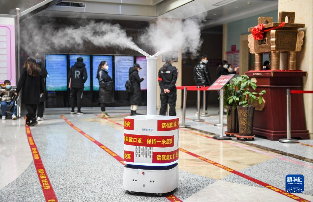 2月23日,在呼和浩特市婦幼保健院門診樓內,消毒機器人正在工作。