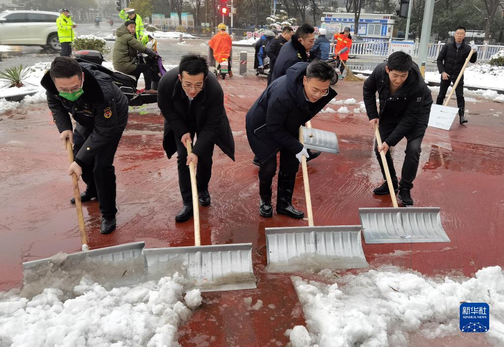 近日,受冷空氣影響,江西南昌迎來(lái)降雪天氣。南昌交警、城管等部門的工作人員及社區(qū)志愿者迅速行動(dòng),掃雪除冰,守護(hù)群眾出行安全。