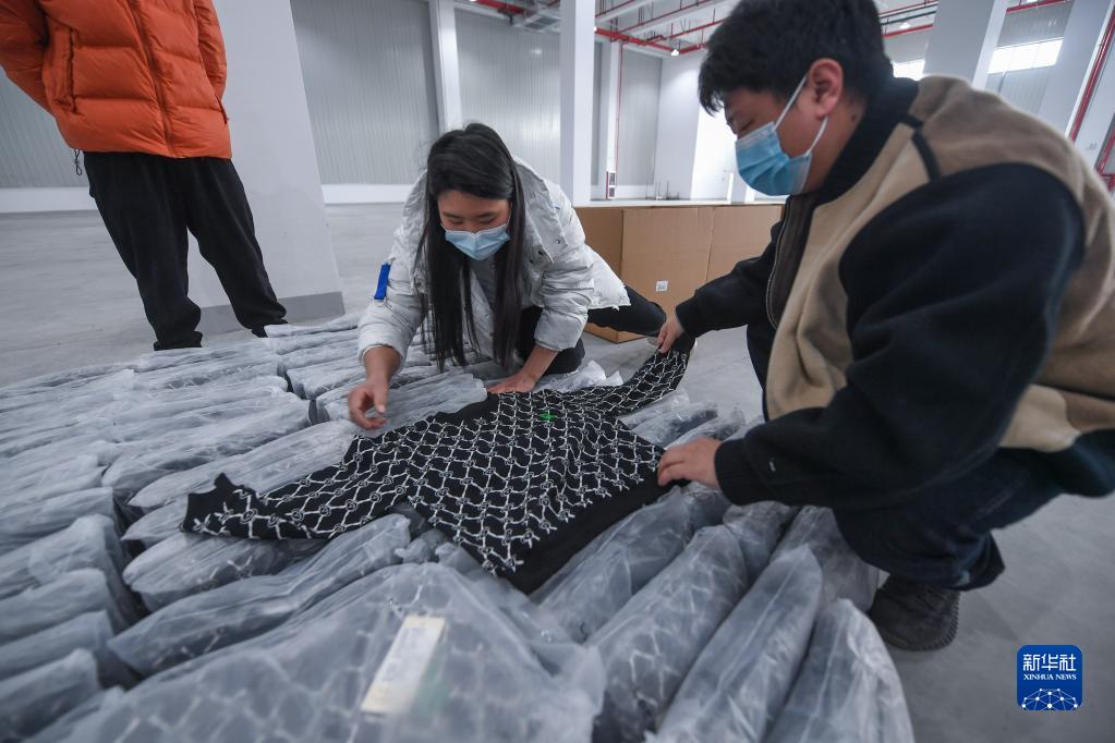 2月23日,湖州市織里鎮一家童裝企業的工作人員在檢查一批要打包裝箱出口的童裝。