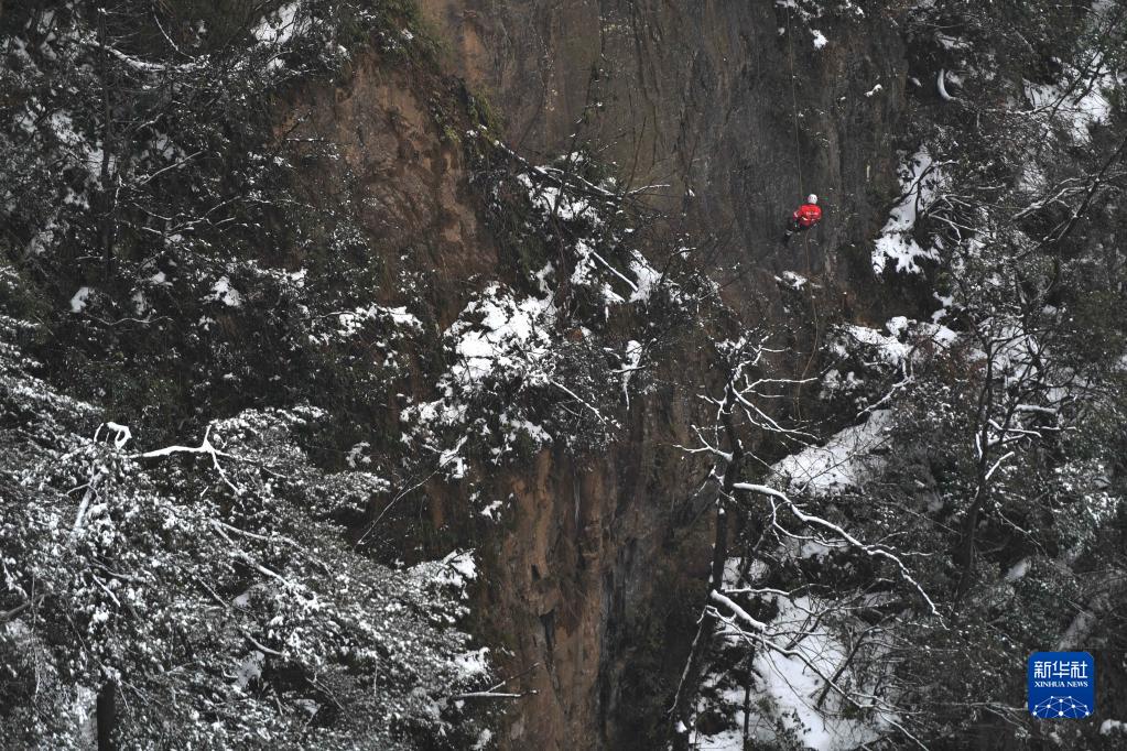 當日,湖南張家界雪后初霽,張家界市武陵源山地應急救援隊隊員來到黃石寨景區,在懸崖峭壁間開展低溫冰雪條件下的應急救援索降訓練,以提高應對惡劣氣候和環境下的應急救援能力。這支救援隊每年不定期組織訓練,被游客親切地稱為“紅衣俠”。