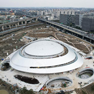 從空中俯瞰即將竣工的杭州亞運會電競館(無人機照片,2月23日攝)。 新華社發(龍巍攝)
