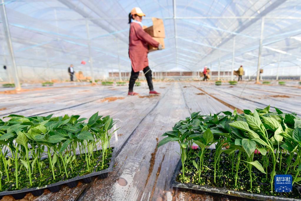 2月23日,工作人員在山東省青州市益都街道一處蔬菜育種實驗田搬運辣椒苗。