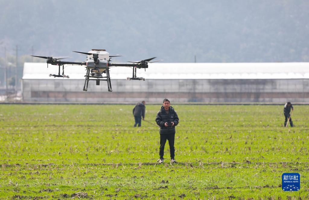 2月23日,在浙江省杭州市臨安區(qū)天目山鎮(zhèn)“天目糧倉(cāng)”基地,種植戶操作無(wú)人機(jī)對(duì)小麥進(jìn)行施肥作業(yè)。