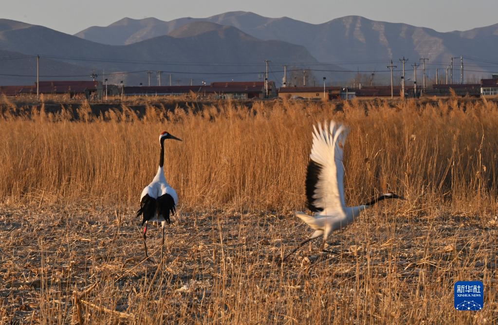 2月23日,兩只國家一級保護動物丹頂鶴在山西省大同市廣靈縣壺流河濕地駐足棲息。新華社記者 馬毅敏 攝