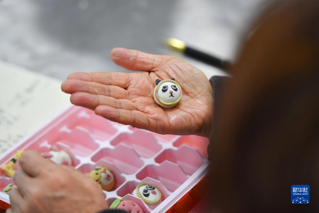 2月24日,在湘潭市雨湖區人力資源和社會保障服務中心,學員在面點師培訓班上學習制作“冰墩墩”造型的湯圓。