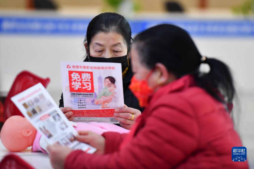 2月24日,在湘潭市雨湖區(qū)人力資源和社會保障服務中心,學員在育嬰員培訓班上學習育嬰知識。