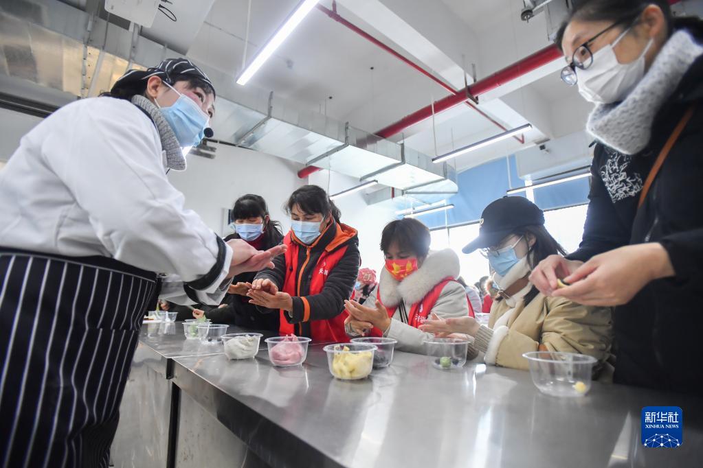 2月24日,在湘潭市雨湖區(qū)人力資源和社會保障服務(wù)中心,老師(左一)在面點師培訓(xùn)班上教學(xué)員制作湯圓。