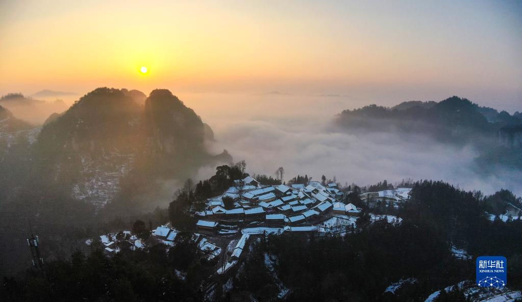 2月24日早上拍攝的湖南省湘西土家族苗族自治州花垣縣雙龍鎮十八洞村雪后日出(無人機照片)。