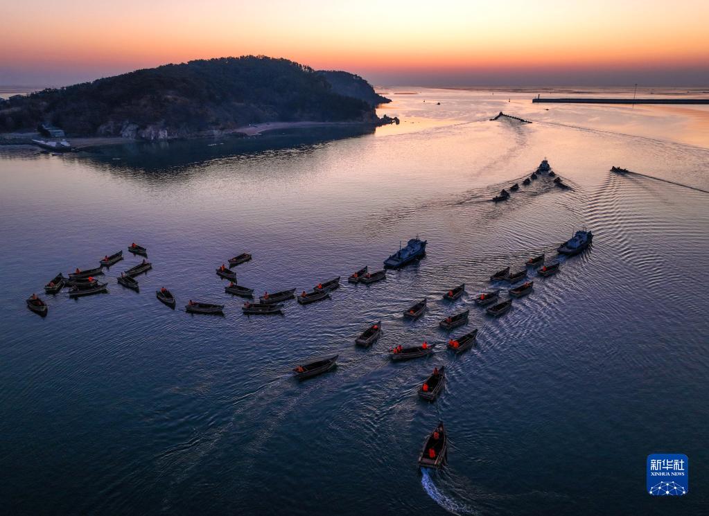 2月24日,在山東省榮成市俚島鎮(zhèn)俚島灣海域,漁民們駕駛著漁船、舢舨迎著朝陽(yáng)出海作業(yè)(無(wú)人機(jī)照片)。