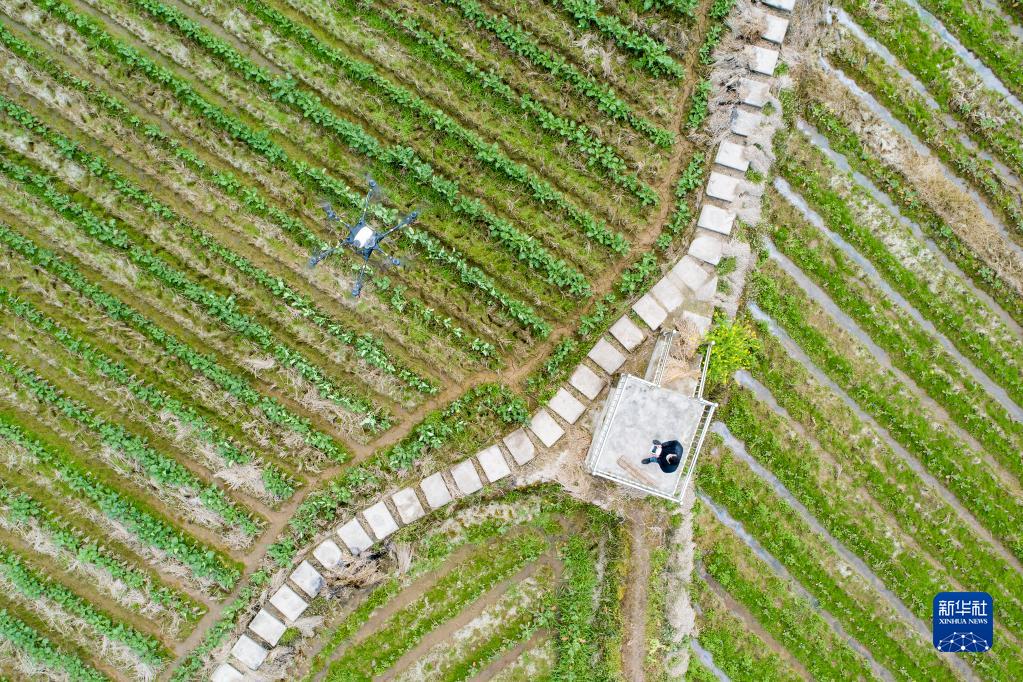 2月24日,在四川省閬中市江南街道,無人機在油菜地上空作業(無人機照片)。