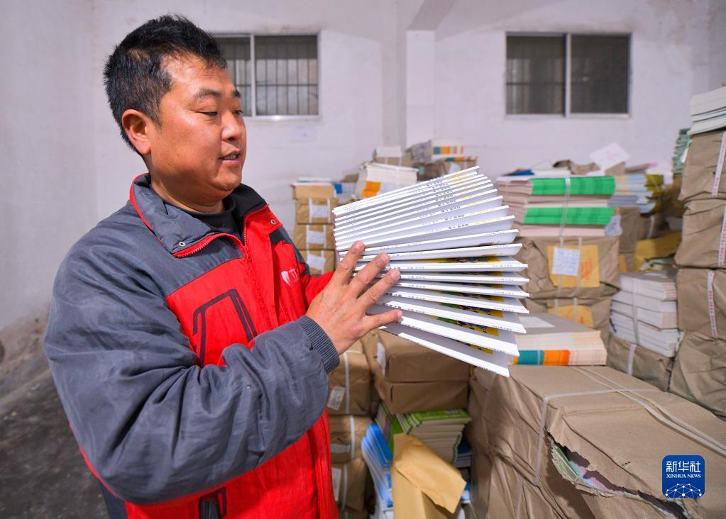 2月26日,在貴州省遵義市余慶縣,書店工作人員在分類整理教材。