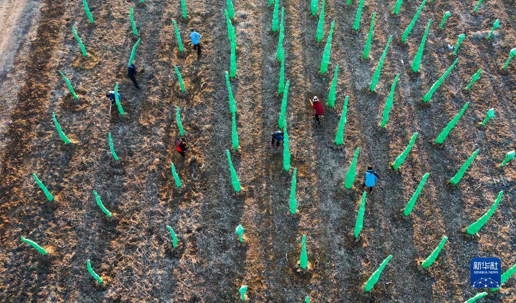 2月27日,河北省遵化市劉備寨鄉農民在樹木苗圃勞作(無人機照片)。