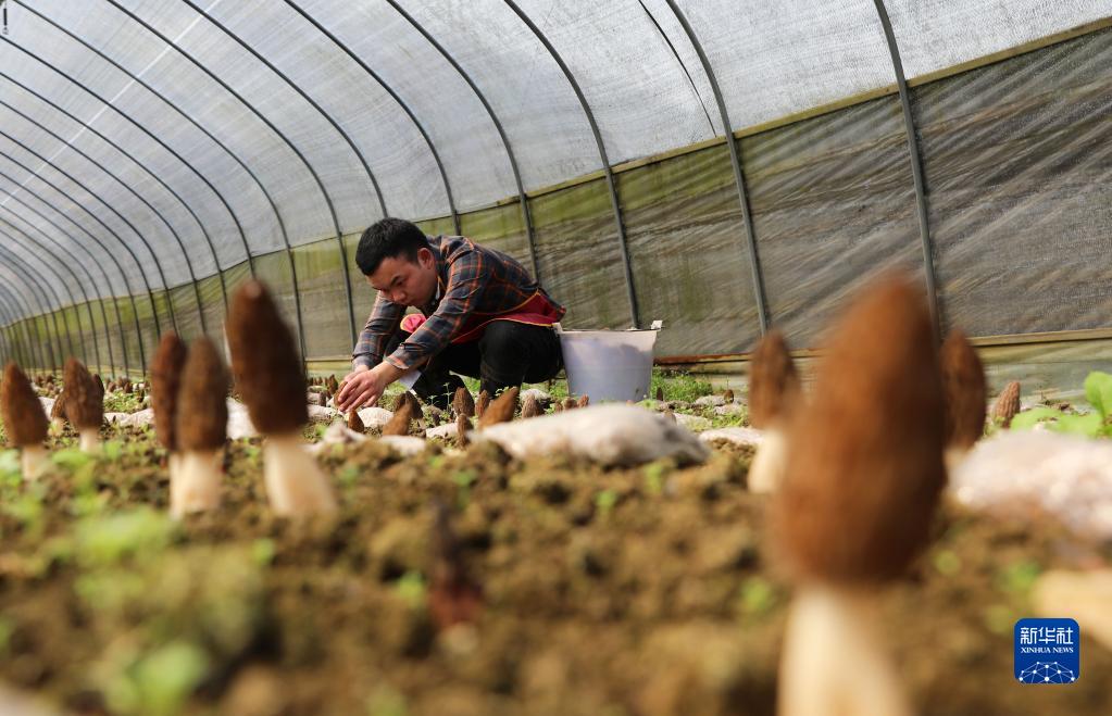 2月28日,村民在貴州省黔西市金蘭鎮(zhèn)龍山村羊肚菌種植基地采收羊肚菌。