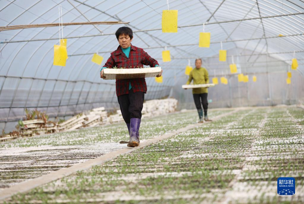2月28日,在湖南省永州市道縣東門街道高車村育苗大棚,菜農在大棚里勞作。