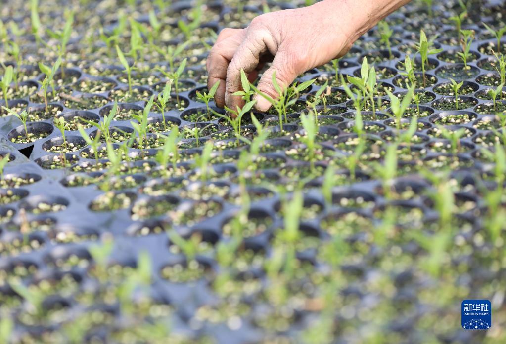 2月28日,在湖南省永州市道縣東門街道高車村育苗大棚,菜農在管護蔬菜苗。