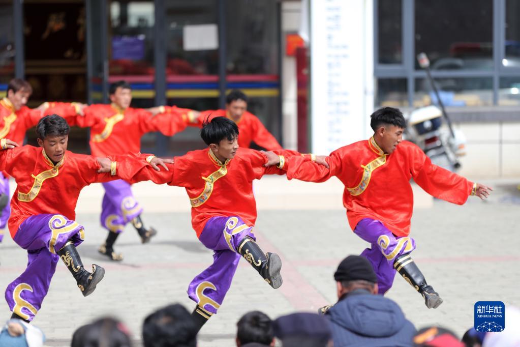 搬遷牧民在搬遷點廣場上跳起民族舞蹈,迎接藏歷新年(2月28日攝)。
