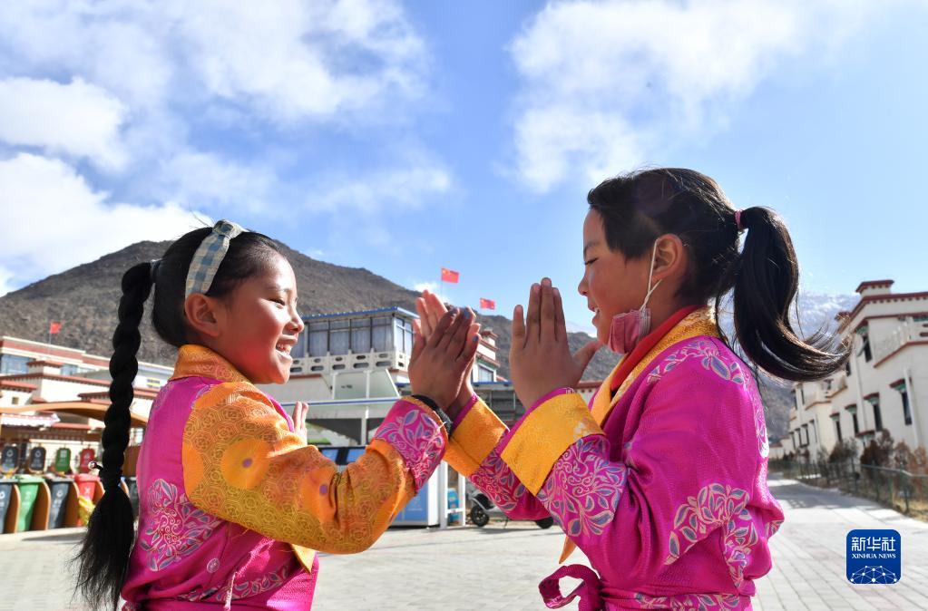 兩位搬遷牧民家的小姑娘穿上盛裝,在榮瑪高海拔生態(tài)搬遷點做游戲(2月28日攝)。