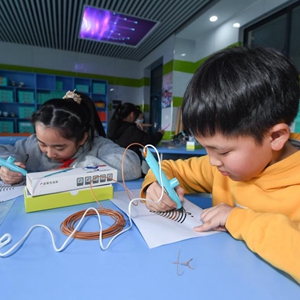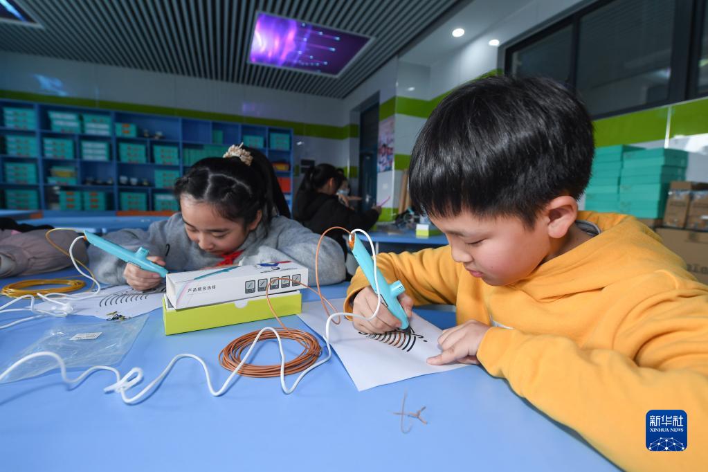 3月1日,城北小學(xué)學(xué)生學(xué)習(xí)用3D打印筆繪制立體圖案。