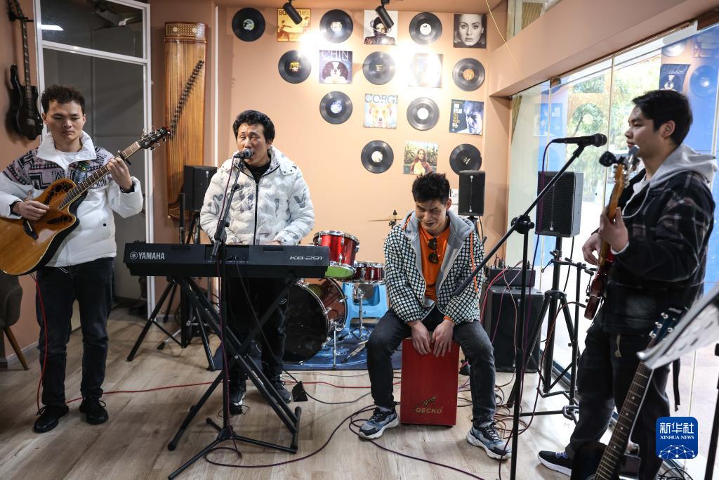 3月1日,“折耳根”樂隊在琴行內排練。從左到右依次是吉他手楊志、主唱陳克興、鼓手陳昌海、貝斯手彭萬海。