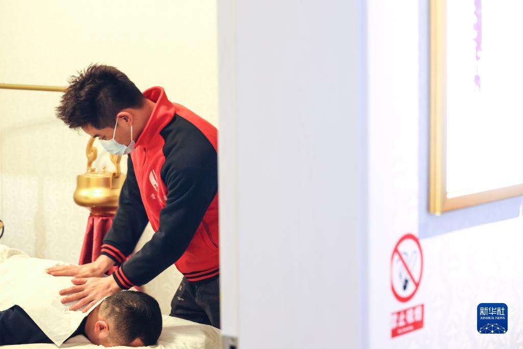 3月1日,“折耳根”樂隊鼓手陳昌海在推拿店內給客人推拿。
