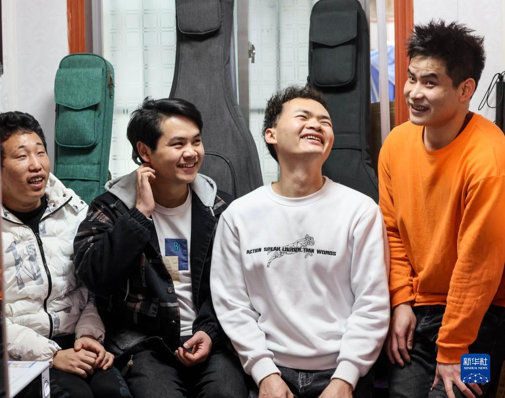 3月1日,“折耳根”樂隊(duì)主唱陳克興(左一)、吉他手楊志(右二)、鼓手陳昌海(右一)、貝斯手彭萬海(左二)在推拿店內(nèi)休息。