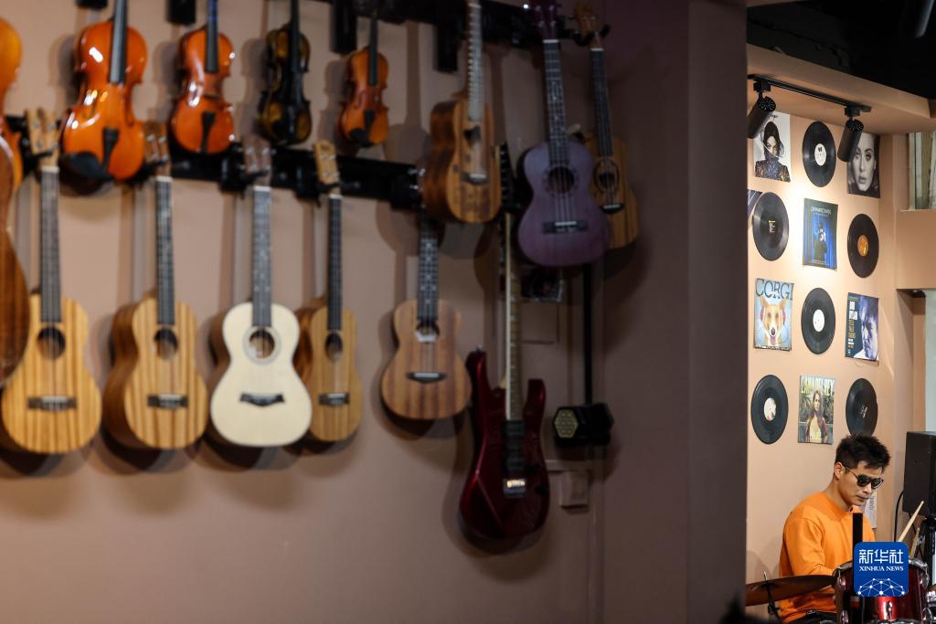 3月1日,“折耳根”樂隊鼓手陳昌海在琴行內排練。