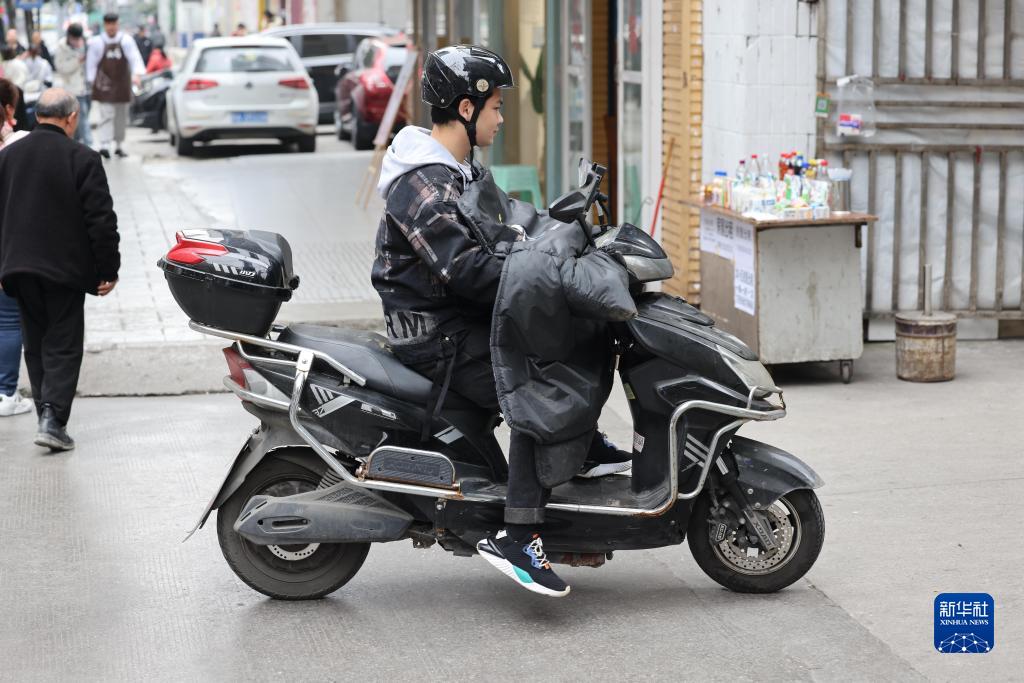 3月1日,“折耳根”樂隊貝斯手彭萬海在路上送外賣。