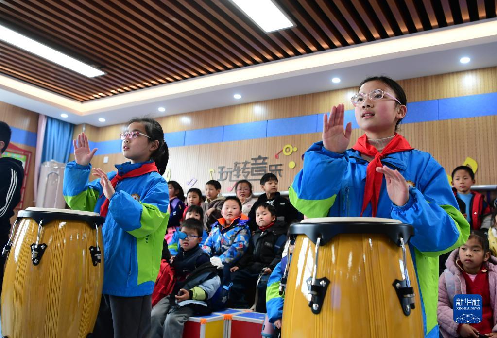 3月2日,在肥西縣嚴店中心學校少年宮,學生進行樂器練習。