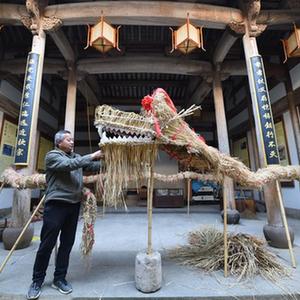 3月2日,在黃山市徽州區(qū)蜀源村,村民檢查編織完成的“草龍”。