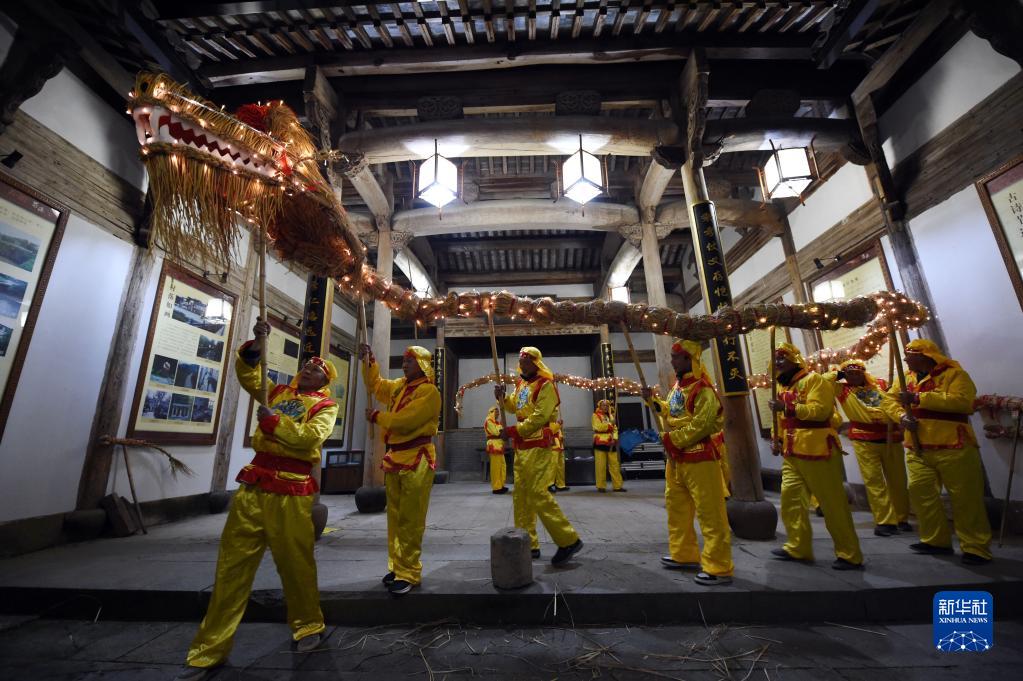 “舞草龍”是安徽省黃山市徽州區(qū)蜀源村特色民俗。在農(nóng)歷二月二“龍?zhí)ь^”來臨之際,當(dāng)?shù)卮迕裼玫静菥幙棧o以毛竹支架,制作長達(dá)10余米的草龍,龍身掛滿燈帶,在古村中巡游,祈求五谷豐登、風(fēng)調(diào)雨順。