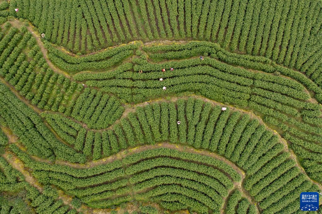 3月3日,村民在景寧縣鶴溪街道敕木山村茶園采茶(無人機照片)。