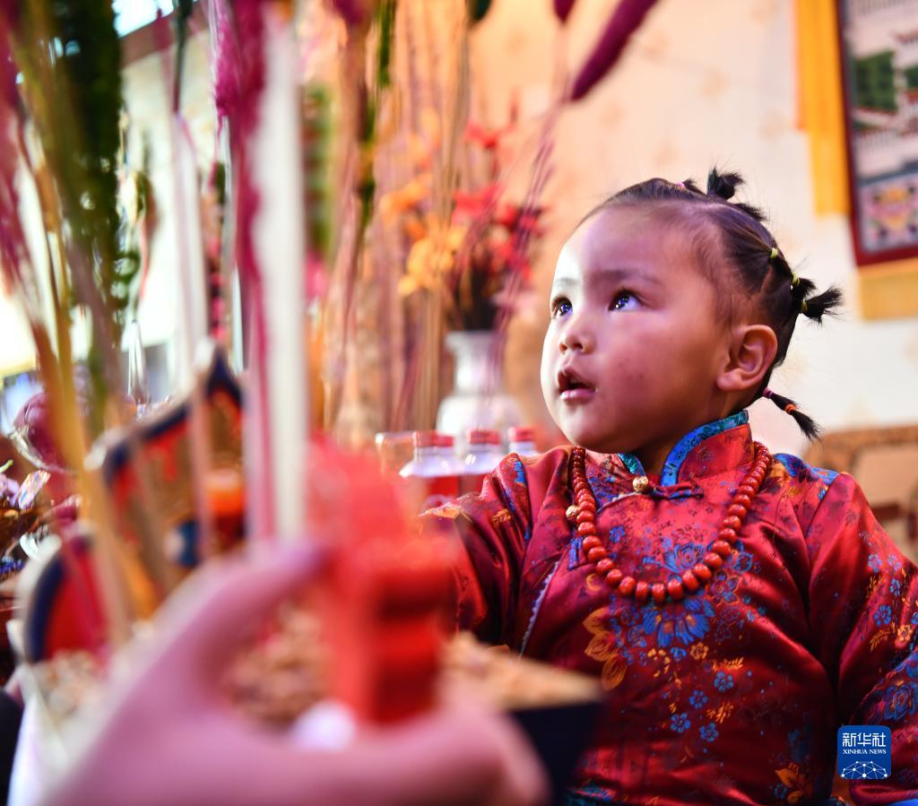 3月3日,在西藏拉薩,身著藏裝的小姑娘在吃“切瑪”。