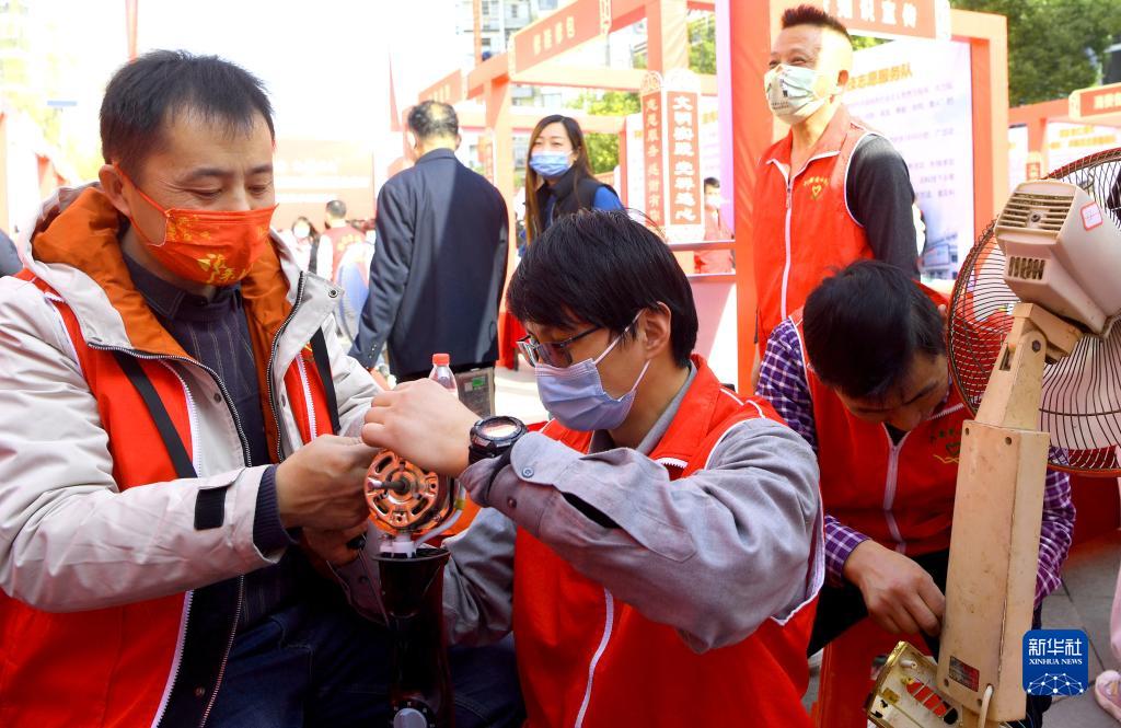 3月3日,安徽省六安市志愿者服務隊為社區(qū)居民維修家電。